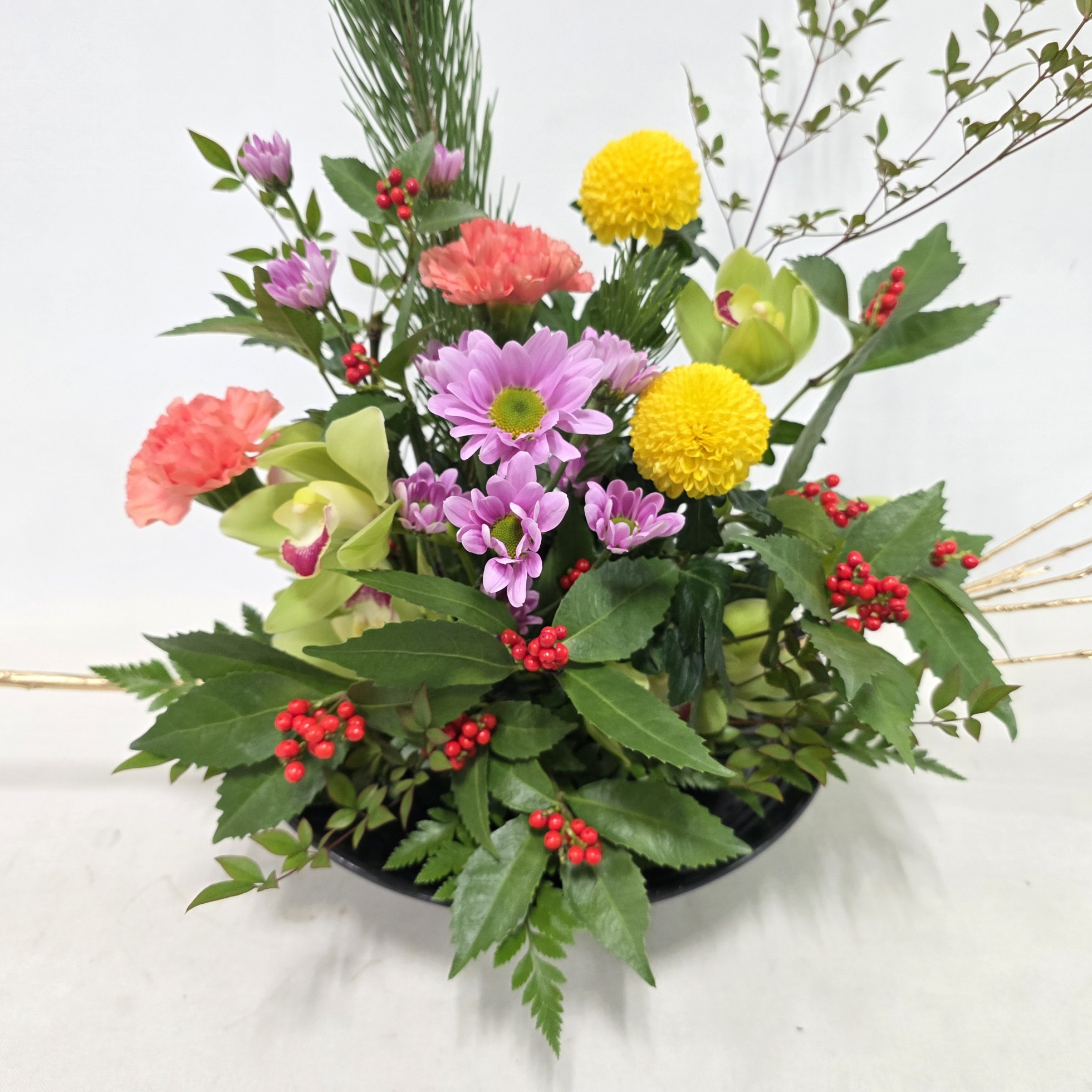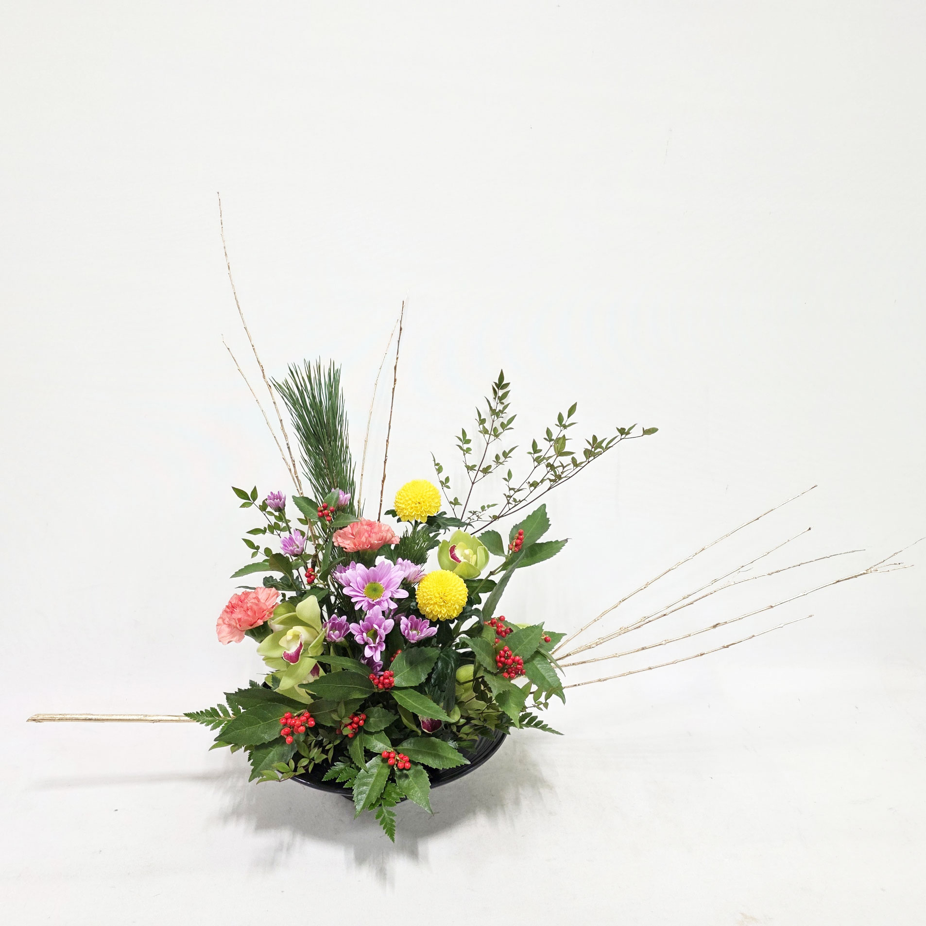 松、シンビジュウム、オンシジュウム、南天の実、オペラピンクマム、スプレーカーネーション、アセビ、金銀行李柳