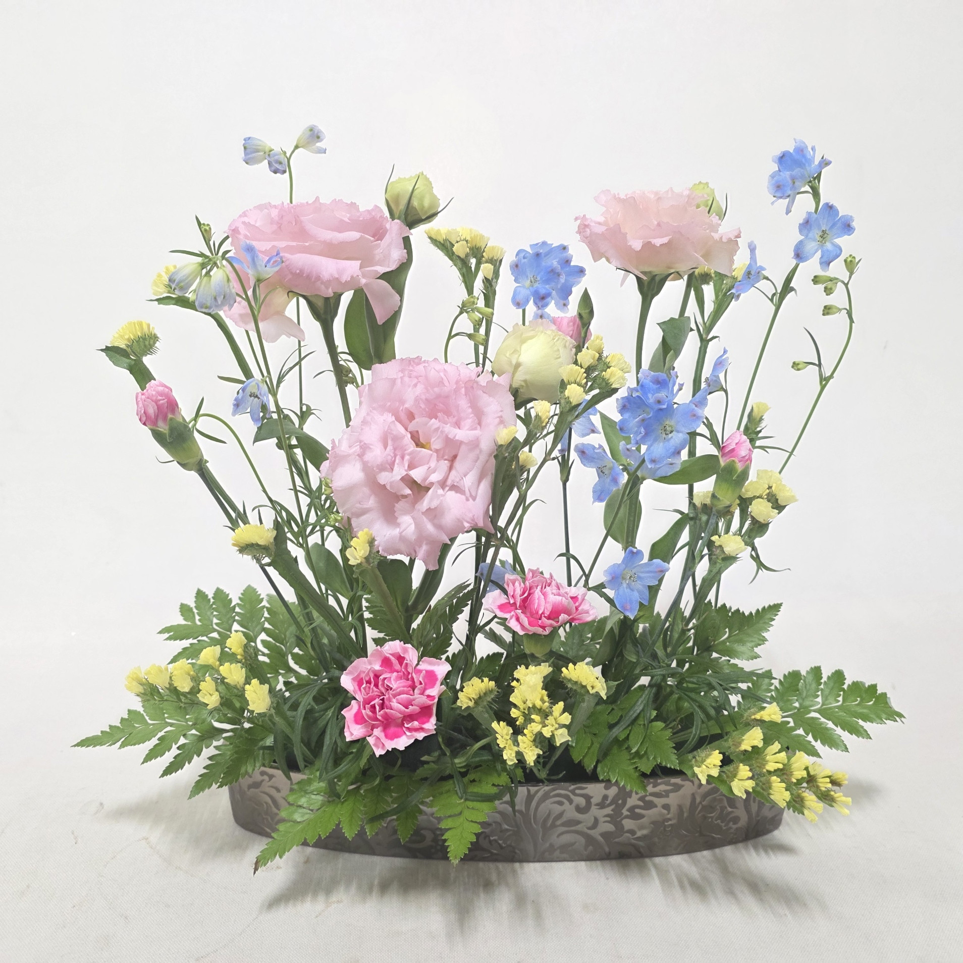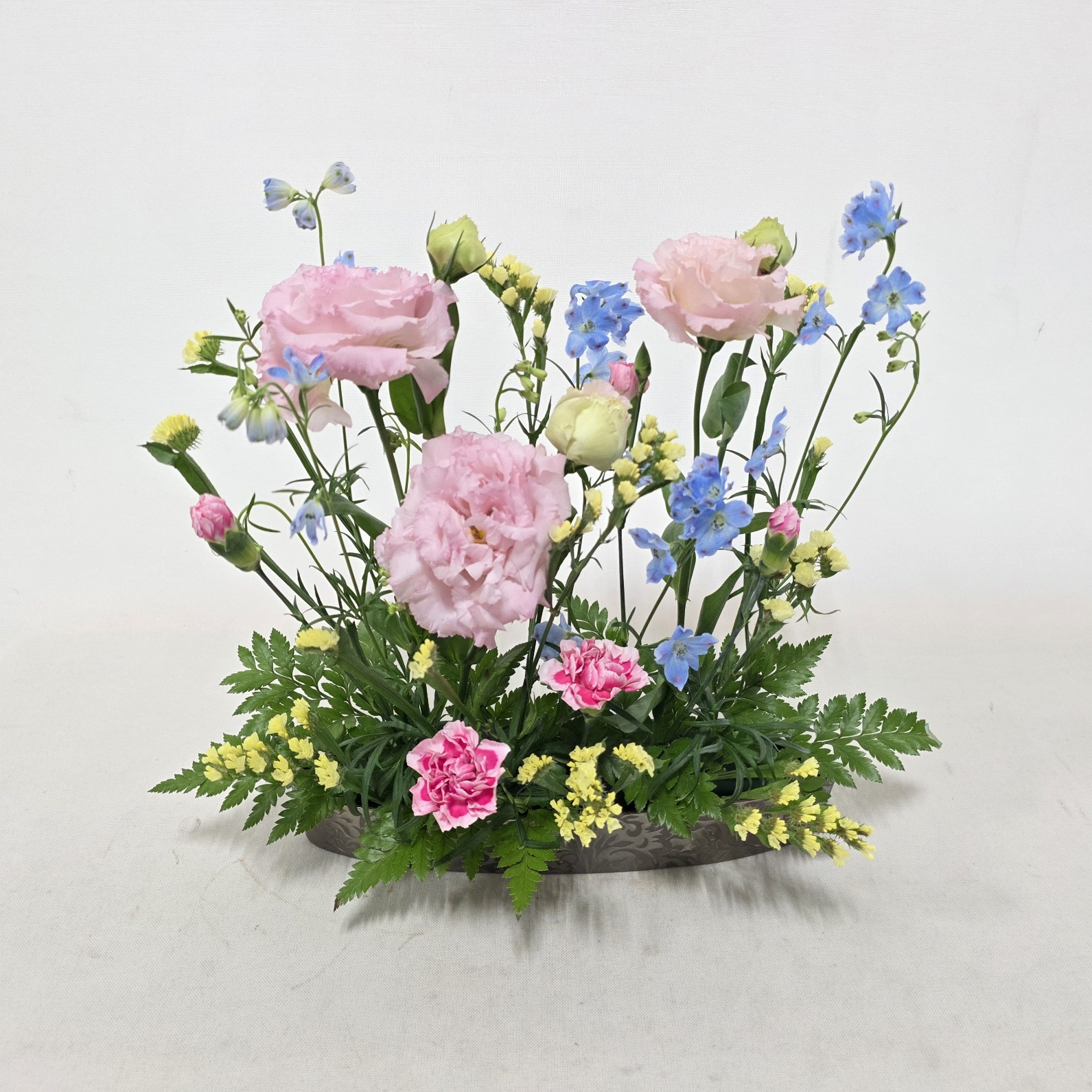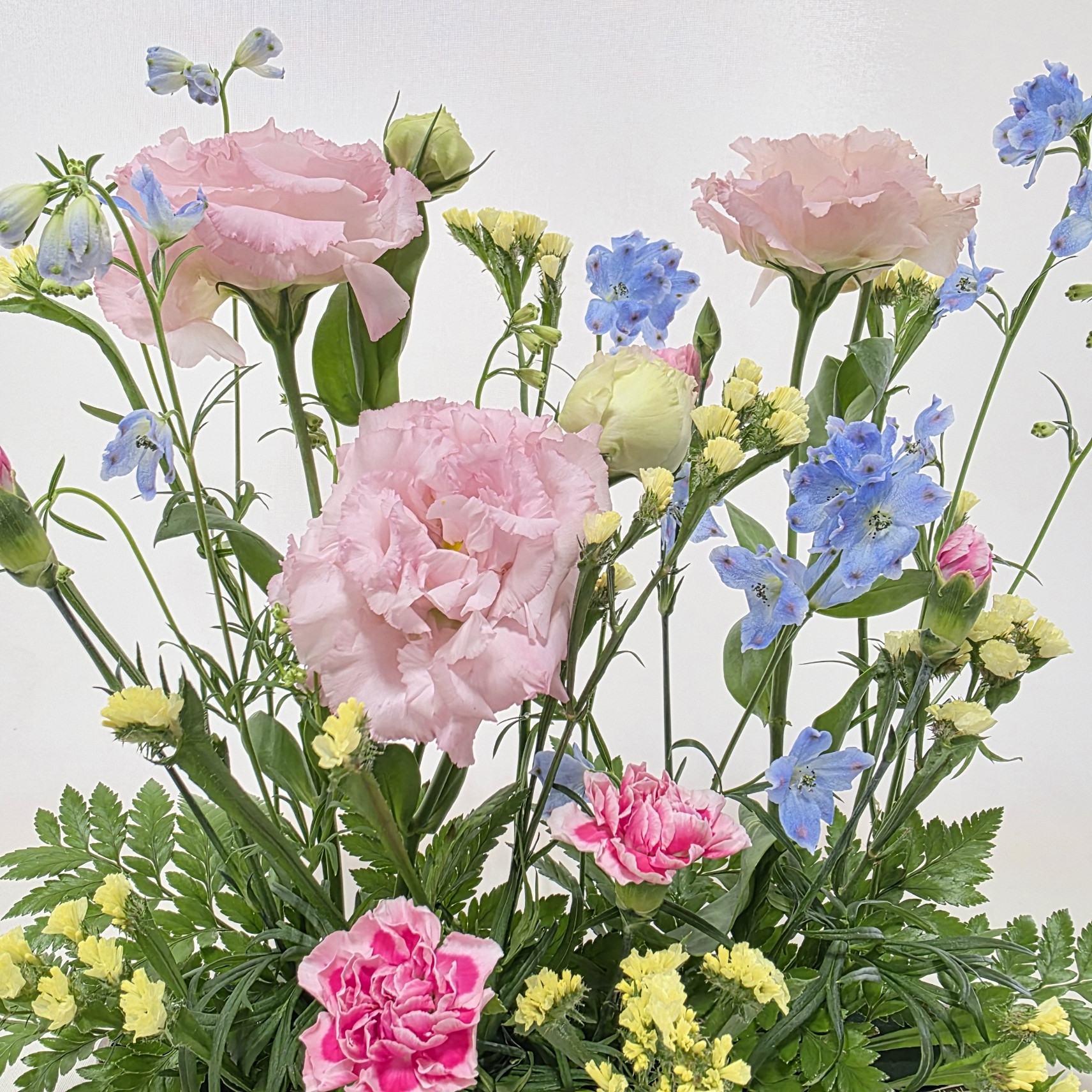 トルコ桔梗、スプレーデルフィニュウム、スターチス、スプレーカーネーション、レザーファン