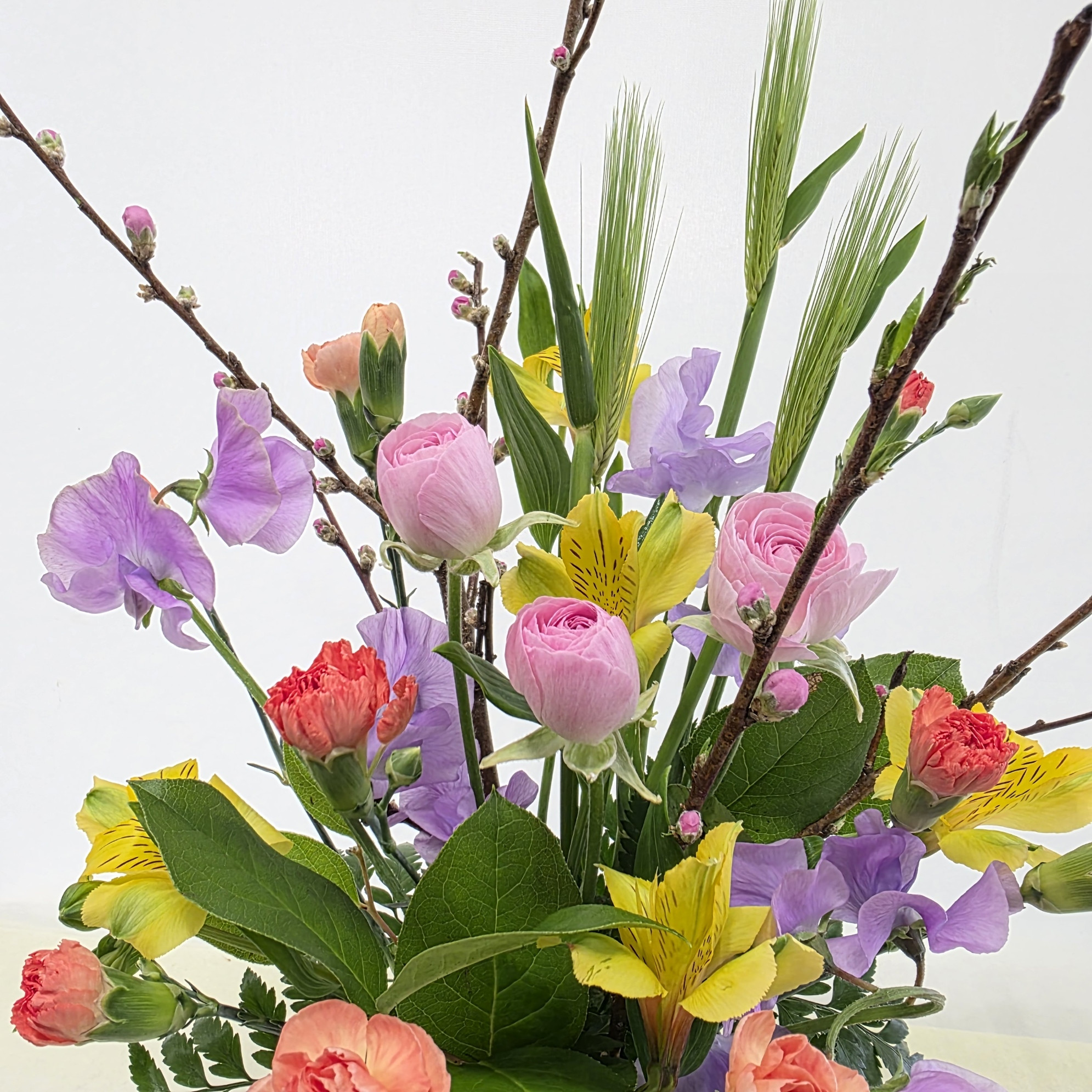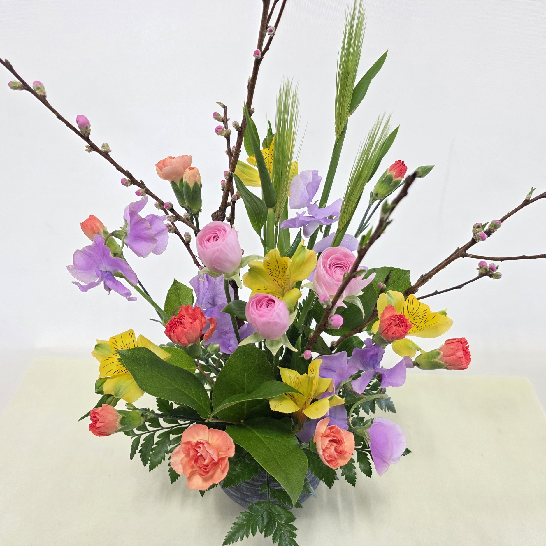 今回は、桃の花、ラナンキュラス、スイートピー、麦、アルストロメリア、スプレーカーネーションなどの花材で、