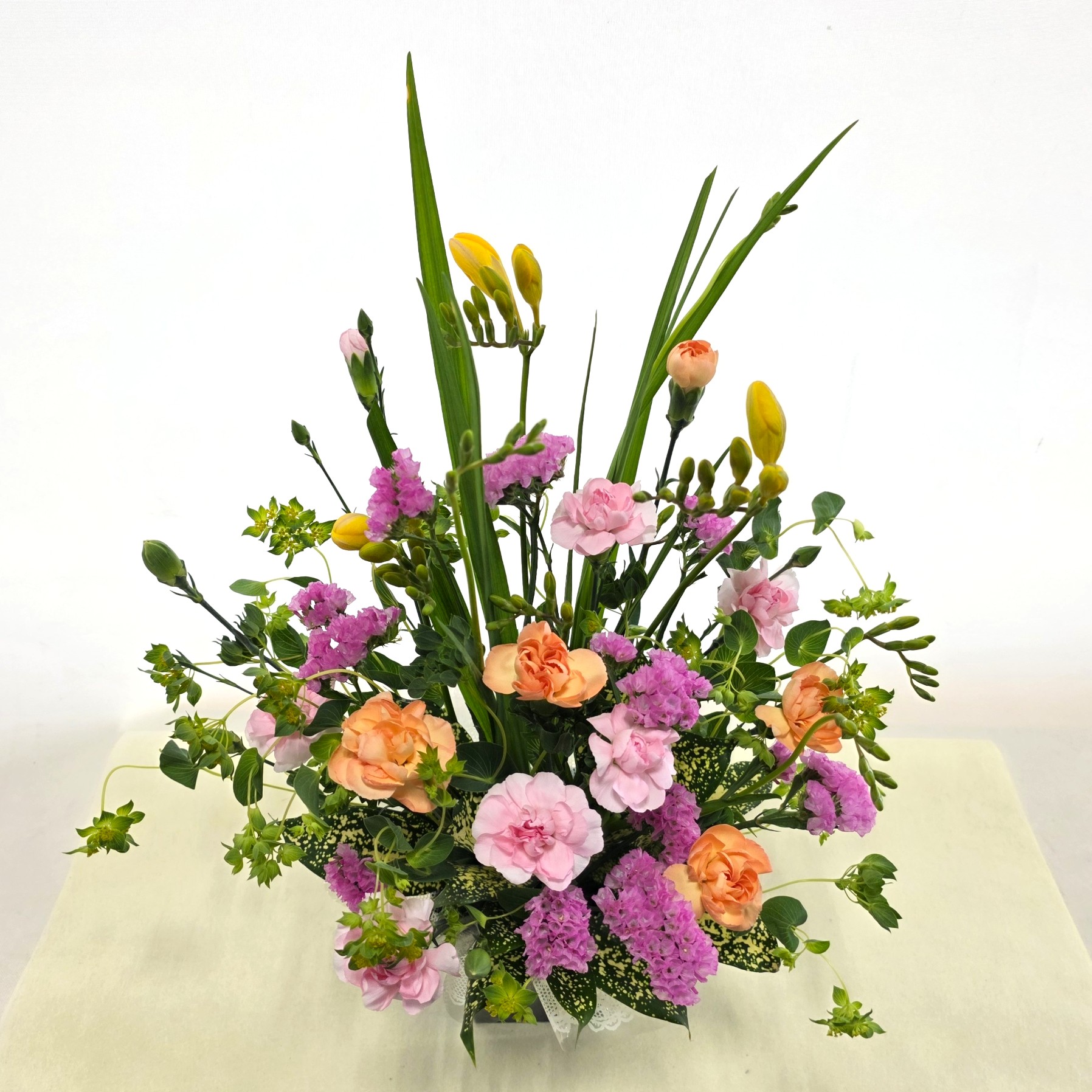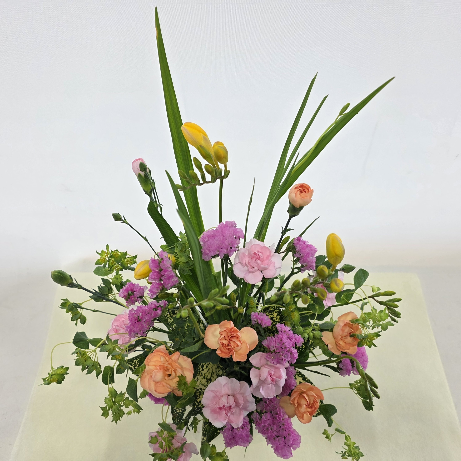 今回は、フリージア、ブプレリウム、スプレーカーネーション、スターチス、ゴッドセアナなどを使ってアレンジします。
