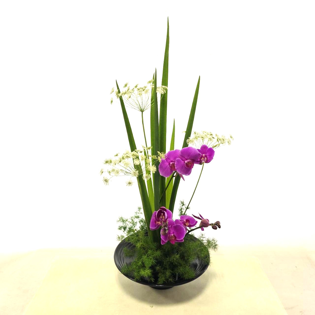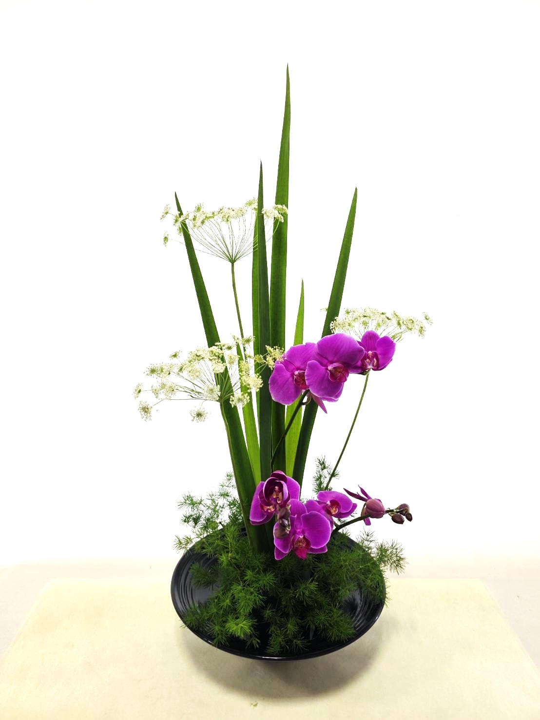 今回は「花の女王」とも称される胡蝶蘭を使って、その気品あふれる姿と凛と佇むオクラレルの葉物でアレンジしたいと思います。